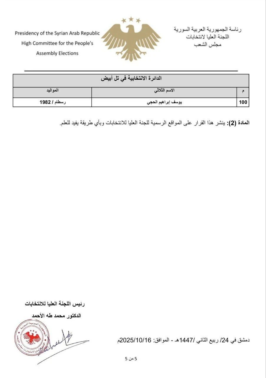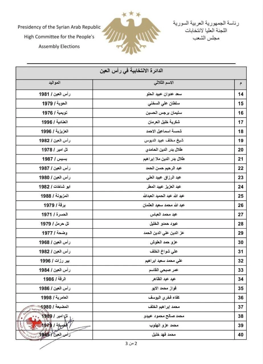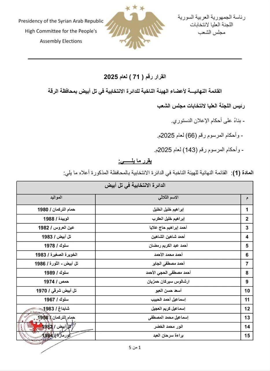 أعلنت اللجنة العليا لانتخابات مجلس الشعب إصدار القرارين (71) و(72)، المتضمنين القوائم النهائية لأعضاء الهيئة الناخبة في تل أبيض بمحافظة الرقة ورأس العين بمحافظة الحسكة، حيث تضم الأولى 100 عضواً والثانية 50 عضواً من أبناء المنطقتين.
