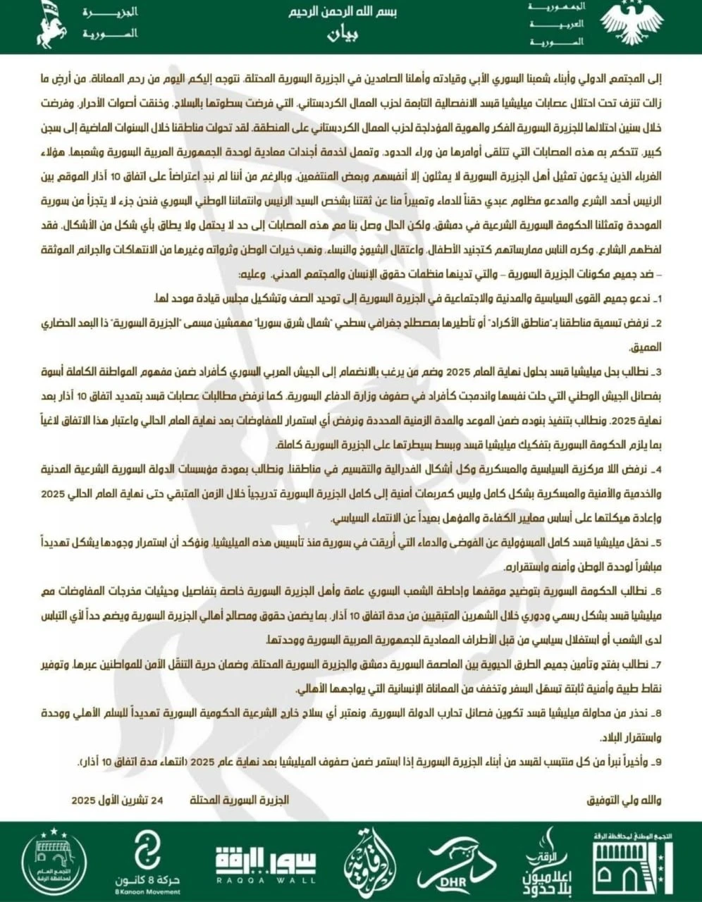 وشدد البيان على ضرورة "عودة مؤسسات الدولة السورية الشرعية المدنية والخدمية والأمنية والعسكرية إلى كامل الجزيرة تدريجيًا حتى نهاية العام الحالي"، ورفض اللامركزية السياسية والعسكرية وكل أشكال الفدرالية والتقسيم، داعيًا إلى إعادة هيكلة المؤسسات على أساس الكفاءة والمؤهل بعيدًا عن الانتماء السياسي.
